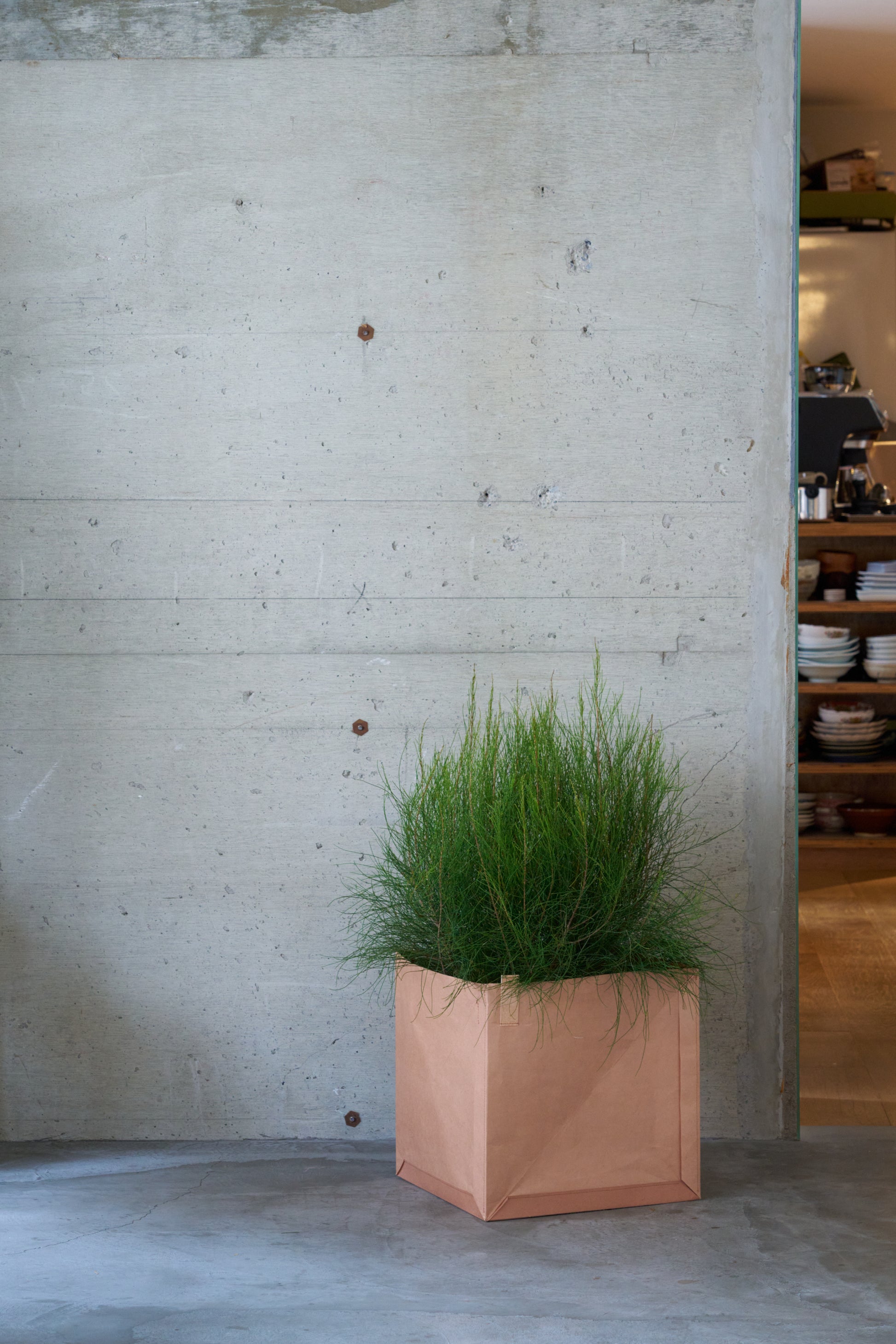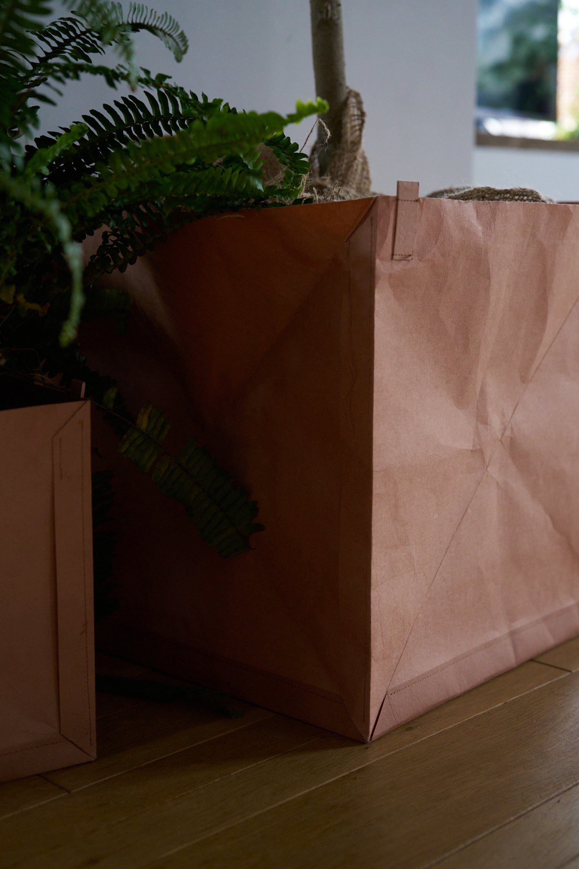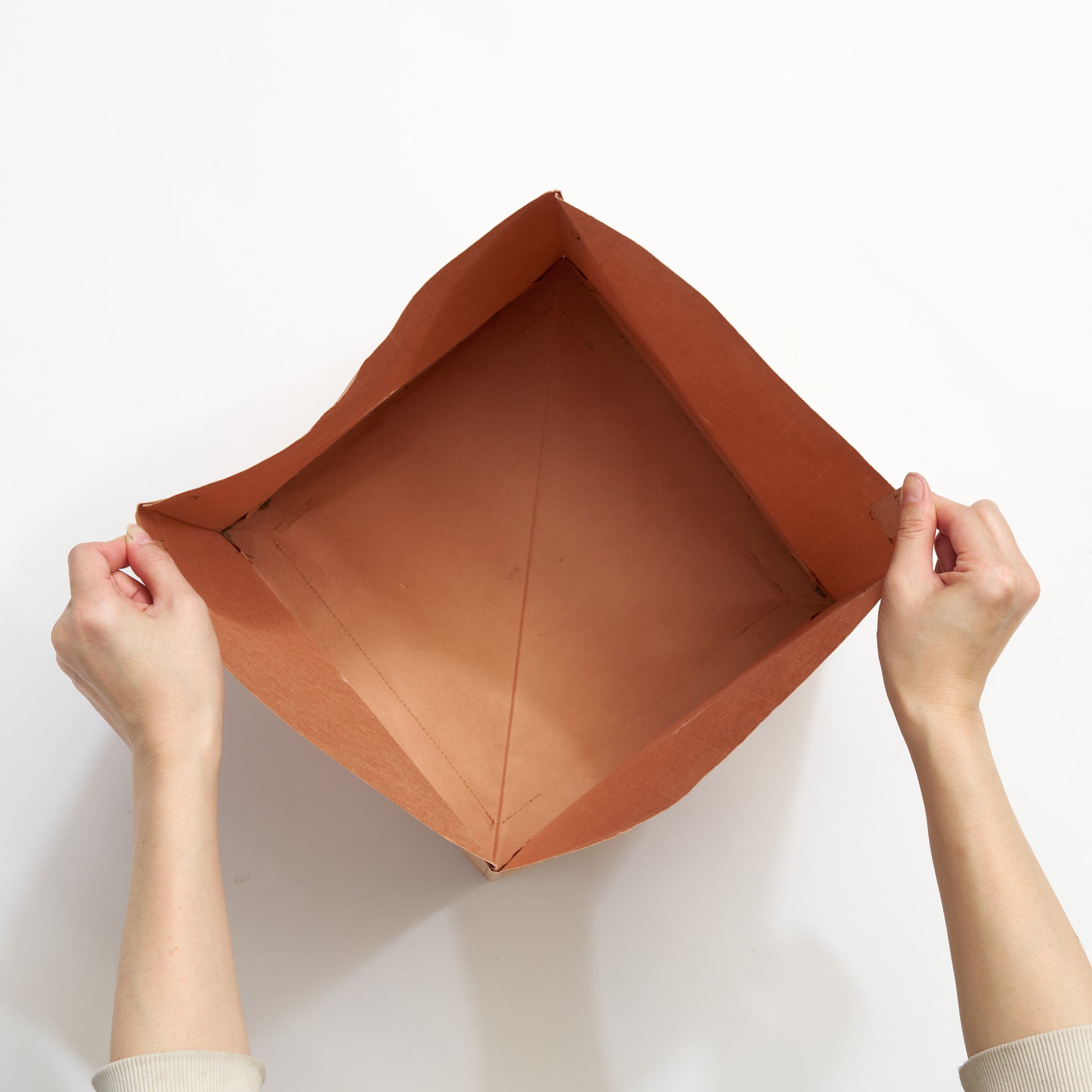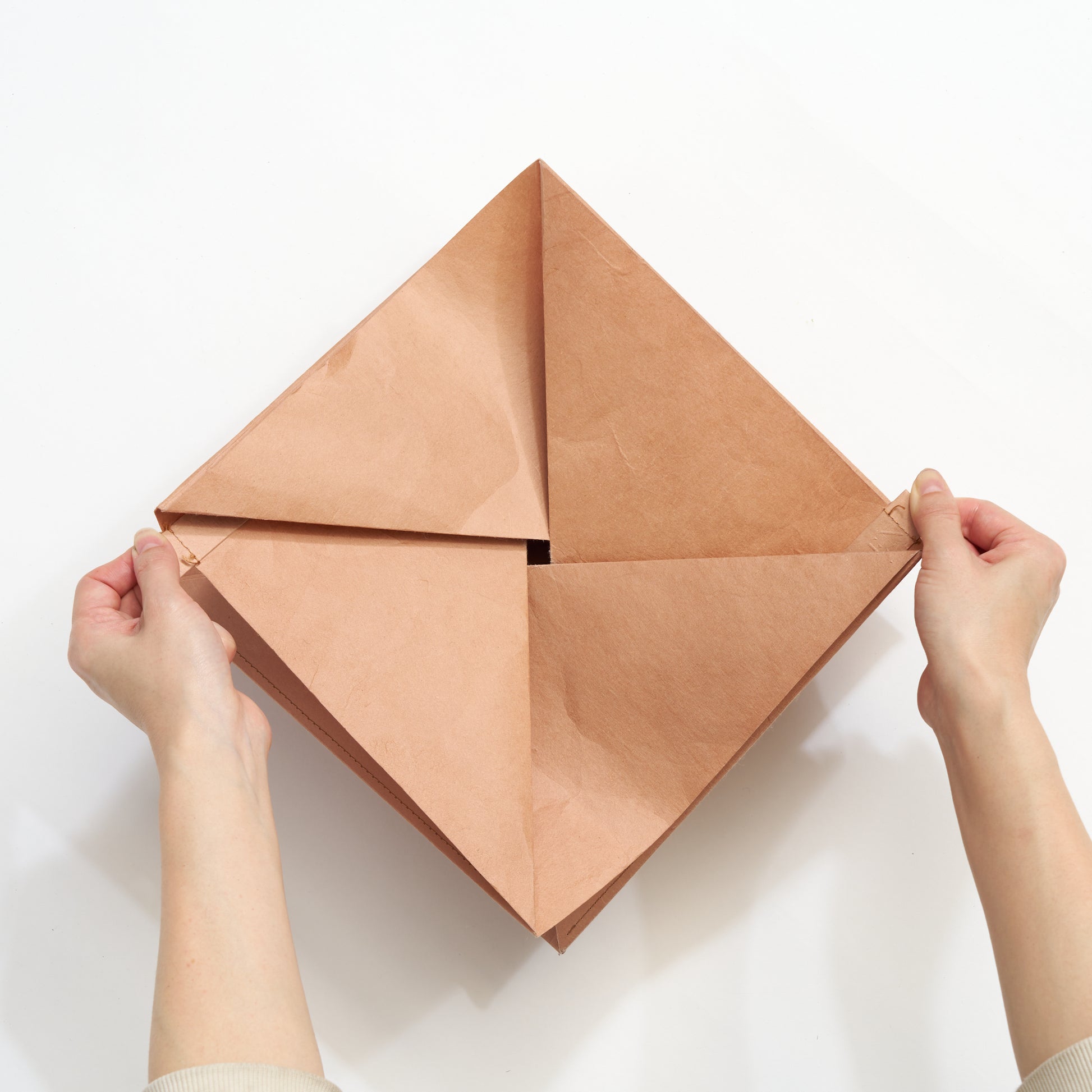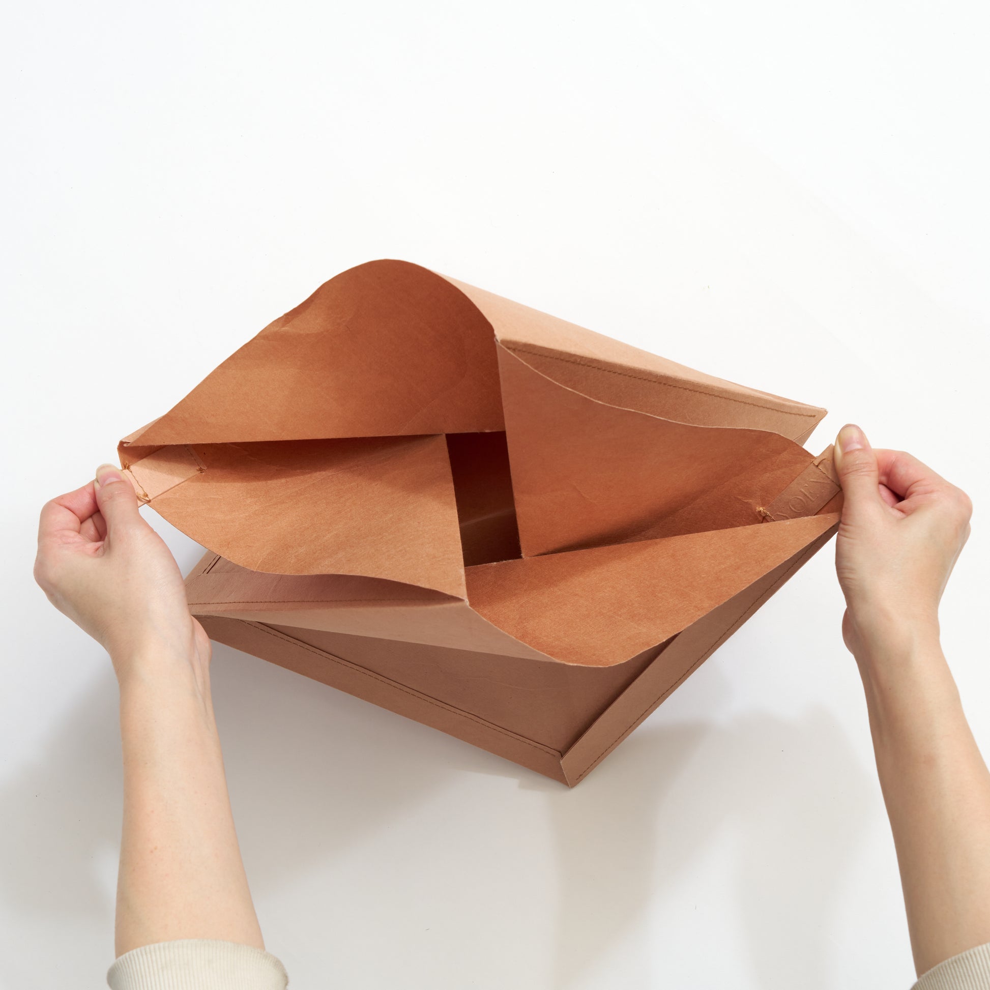 使用しないときはパタンと折り畳める実用性を兼ね備えた、紙ならではの形状も特徴。耐久・耐水・防腐性を高める柿渋染を施しています。