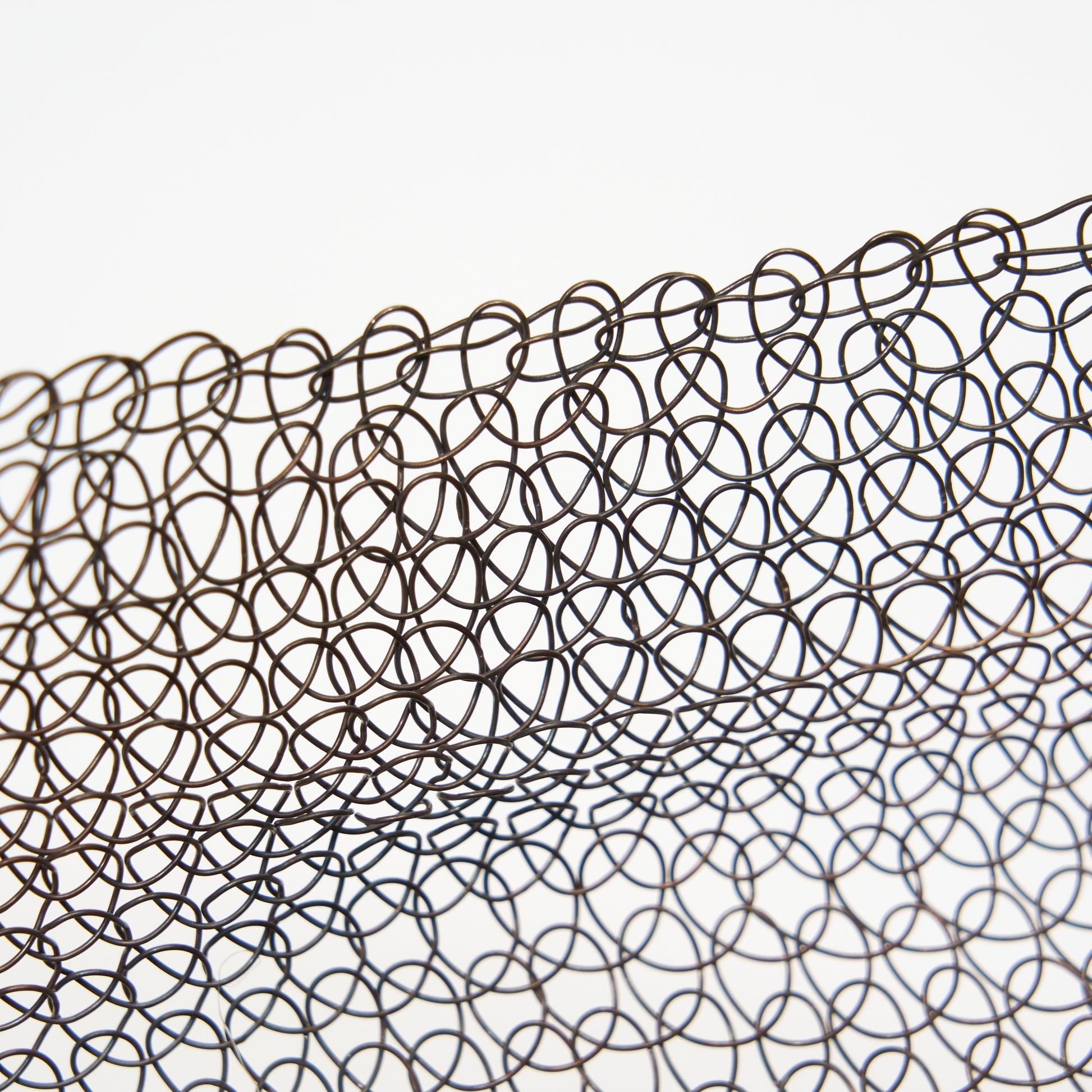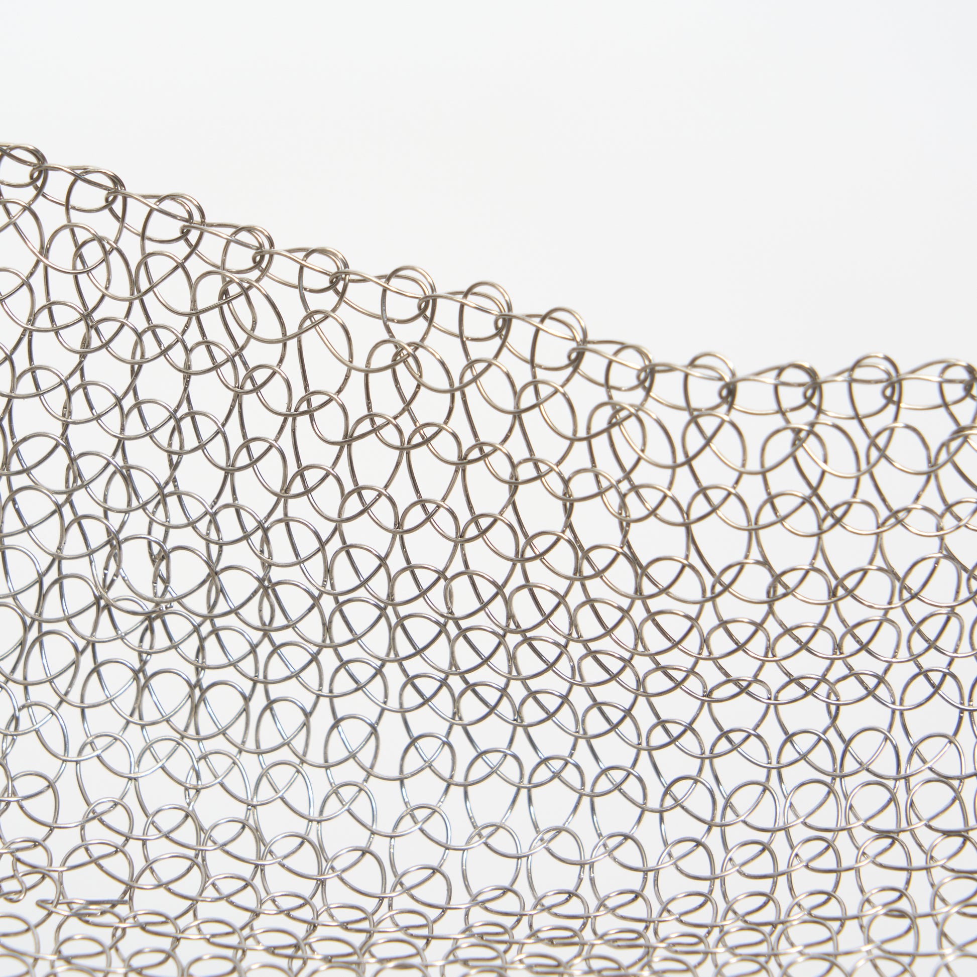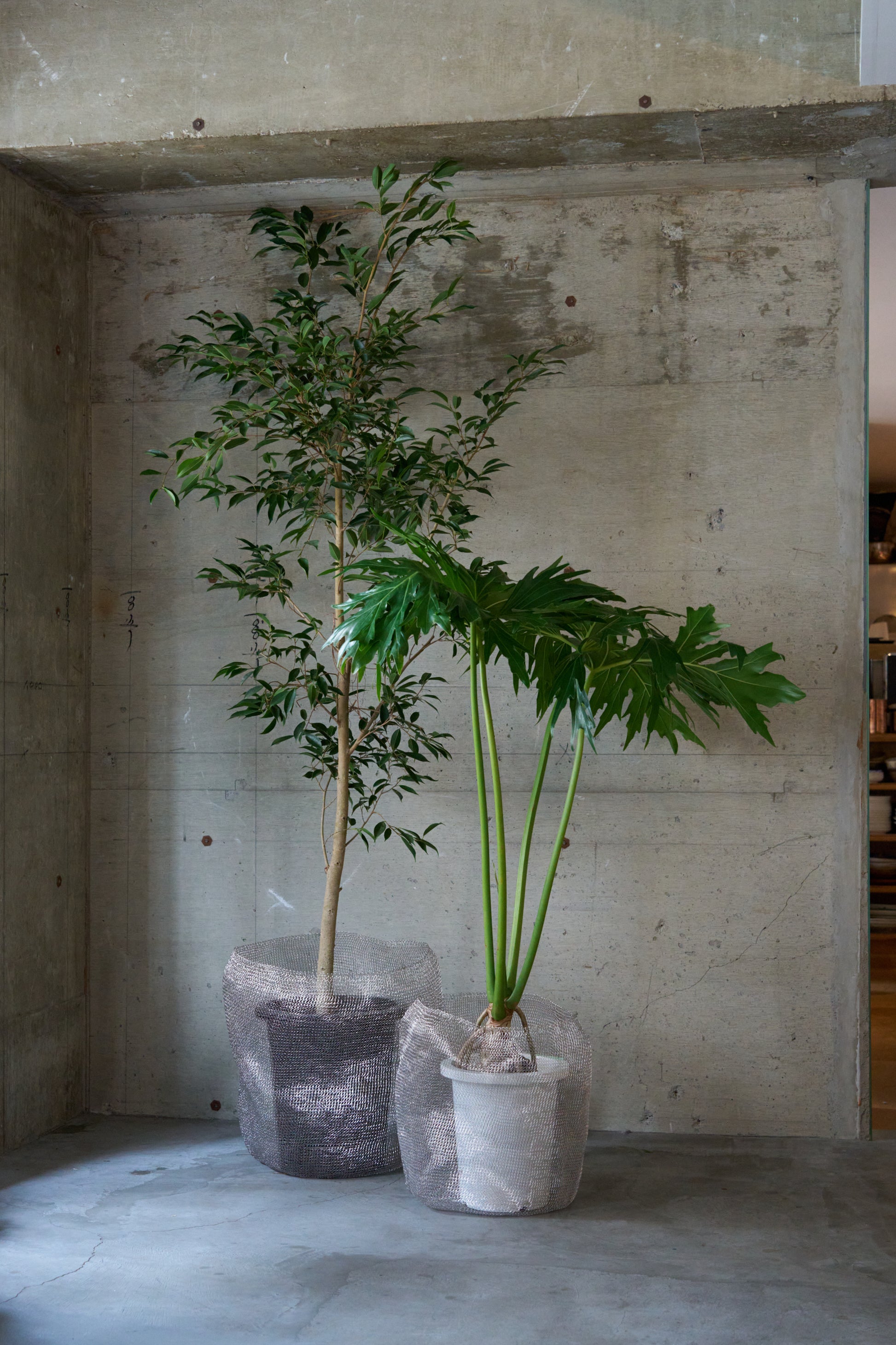 手編みの金属織りが軽やかな印象を与える鉢カバーは、10 号にぴったりな L サイズと、8 号の鉢カバーとしてぴったりな M サイズ。